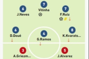 队报评分巴黎4-0马竞:克瓦拉8分全场最高 马竞中卫组合均2分最低