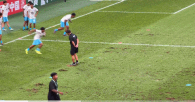 著名球迷、博主何胜拍摄了赛前球员热身,在球场一侧的区域坑坑洼洼,甚至有北马里亚纳球员被翻起的草绊倒。何胜表示,“赶紧去补一补吧,一会还怎么踢?”